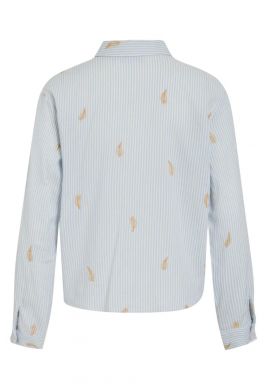 Camisa con cierre de botones de rayas azul y blanco con hojas bordadas en camel. Composición: 50 % Viscosa y 50% Algodón.