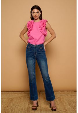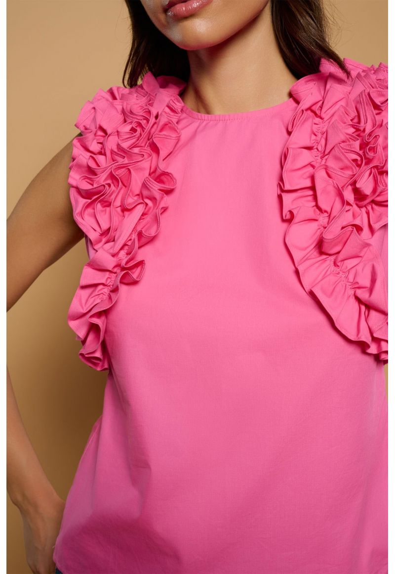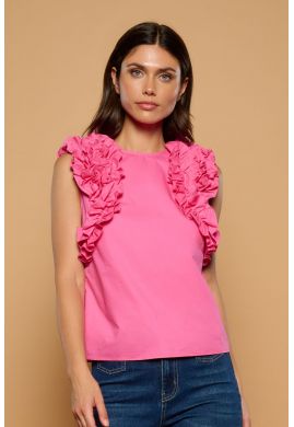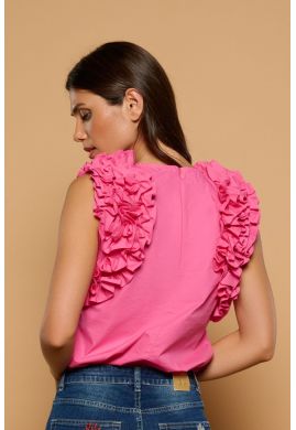 Top en color fucsia con cuello redondo y manga sisa. Cierre de cremallera trasera. Detalle de volantes fruncidos en sisas. Composición: 100% Algodón.