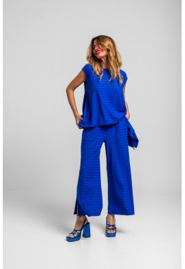 Pantalón azul con rayas verticales blancas. Composición: 65 %Algodón ,32% Poliester y 3% Elastano.