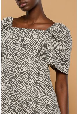 Vestido de escote cuadrado y manga abullonada. con bolsillos. Corte fluido recto. Tejido mezcla con lino. Composición: 60% Poliester,30 %Algodón y 10% Lino.